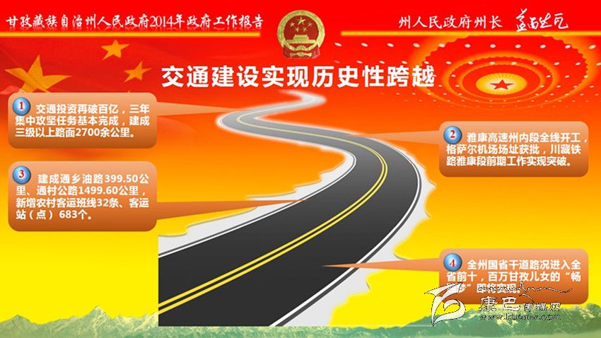 交通建設(shè)實(shí)現(xiàn)歷史性跨越。交通投資再破百億,建成三級以上路面2700余公里。雅康高速州內(nèi)段全線開工,格薩爾機(jī)場場址獲批,川藏鐵路雅康段前期工作實(shí)現(xiàn)突破。建成通鄉(xiāng)油路399.5公里、通村公路1499.6公里,新增農(nóng)村客運(yùn)班線32條、客運(yùn)站(點(diǎn)) 683個(gè)。全州國省干道路況進(jìn)入全省前十。徹底告別無電鄉(xiāng)歷史。完成投資100億元,“電力天路”等項(xiàng)目順利實(shí)施,“川藏聯(lián)網(wǎng)” 工程提前半年建成投運(yùn);18個(gè)縣實(shí)現(xiàn)與主網(wǎng)連網(wǎng);“遠(yuǎn)村點(diǎn)亮”全面完成。城鄉(xiāng)面貌煥然一新。堅(jiān)持建好縣城,全州市政基礎(chǔ)設(shè)施有效提升。堅(jiān)持做大集鎮(zhèn),改造小城鎮(zhèn)危舊房1118戶;投入1.34億元完善姑咱、馬尼干戈、香格里拉、八美4個(gè)省級“百鎮(zhèn)試點(diǎn)”鎮(zhèn)市政設(shè)施,13個(gè)鄉(xiāng)獲準(zhǔn)撤鄉(xiāng)建鎮(zhèn)。堅(jiān)持做美村寨,成功創(chuàng)建45個(gè)省級“美麗鄉(xiāng)村”示范村,19個(gè)州級幸福美麗新村試點(diǎn)建設(shè)全面啟動(dòng),打造新村聚居點(diǎn)235個(gè),建成藏區(qū)新居1.11萬戶。全州城鎮(zhèn)化率達(dá)到27%。通信覆蓋越來越廣。完成投資4.53億元,國省干線和主要旅游景區(qū)通信網(wǎng)絡(luò)實(shí)現(xiàn)連續(xù)覆蓋。生態(tài)底色更加鮮明。編制完成《甘孜州生態(tài)文明建設(shè)規(guī)劃》,落實(shí)國家生態(tài)功能區(qū)轉(zhuǎn)移支付資金6.8億元,生態(tài)保護(hù)與建設(shè)工程加快推進(jìn),草原植被、森林覆蓋率分別達(dá)到78%、33.04%。