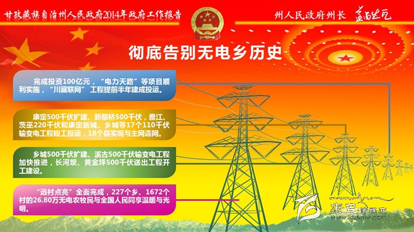 大力推進(jìn)電力通信建設(shè)。投入20億元,加快實(shí)施“電力天路”、無電地區(qū)電力建設(shè)新增項(xiàng)目和農(nóng)網(wǎng)改造升級工程,切實(shí)緩解邊遠(yuǎn)地區(qū)群眾缺電問題;完成長河壩電站500千伏等3個(gè)輸變電項(xiàng)目;統(tǒng)籌抓好表后入戶工程,確保群眾安全用電。投入6億元,新建通信光纜2360公里、基站1025個(gè),解決國省干道、旅游景區(qū)景點(diǎn)信號(hào)盲區(qū);新增30個(gè)自然村通電話、545個(gè)行政村通寬帶,出口總帶寬達(dá)到82G。