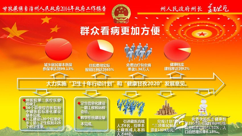 加大民生投入,全年民生支出139億元。全州城鎮(zhèn)新增就業(yè)7400人,城鄉(xiāng)低保實(shí)現(xiàn)應(yīng)保盡保;在全省民族地區(qū)率先實(shí)施醫(yī)療保險(xiǎn)制度城鄉(xiāng)統(tǒng)籌,異地就醫(yī)即時(shí)結(jié)算全面啟動(dòng);在全省率先出臺(tái)大病醫(yī)療保險(xiǎn)規(guī)定。教育事業(yè)加快發(fā)展。新建35所鄉(xiāng)中心幼兒園、22所片區(qū)寄宿制學(xué)校,州高級中學(xué)開工建設(shè)。全面落實(shí)教育助學(xué)惠民政策,兌現(xiàn)各類補(bǔ)助金4.58億元。城鄉(xiāng)居民基本醫(yī)保參保率達(dá)到99.13%,健康檔案建檔率達(dá)到92%;開工建設(shè)120個(gè)標(biāo)準(zhǔn)化鄉(xiāng)(鎮(zhèn))衛(wèi)生院和225個(gè)村衛(wèi)生室;衛(wèi)生信息化建設(shè)一期工程和遠(yuǎn)程會(huì)診、教學(xué)系統(tǒng)建設(shè)基本完成;兌現(xiàn)計(jì)劃生育“三項(xiàng)惠民制度”資金1809萬元。群眾文化生活日益豐富。建成縣“兩館”12個(gè);開工建設(shè)州民族體育館、州農(nóng)牧民演藝培訓(xùn)中心和14個(gè)縣級全民健身中心,建成農(nóng)民體育健身工程739個(gè);開展 “送文化下鄉(xiāng)”近千場;康巴文化研究院“四大工程”全面啟動(dòng)。深入實(shí)施“百千萬康巴英才工程”,人才科技工作扎實(shí)有效。扶貧移民工作成效明顯。完成1360個(gè)貧困村、19.91萬扶貧對象立卡建檔工作;實(shí)施整村推進(jìn)63個(gè)、連片開發(fā)項(xiàng)目4個(gè)、彝家新寨(村)17個(gè)、索改橋23座,易地扶貧搬遷9850人,2.65萬群眾生產(chǎn)生活條件得到改善。
