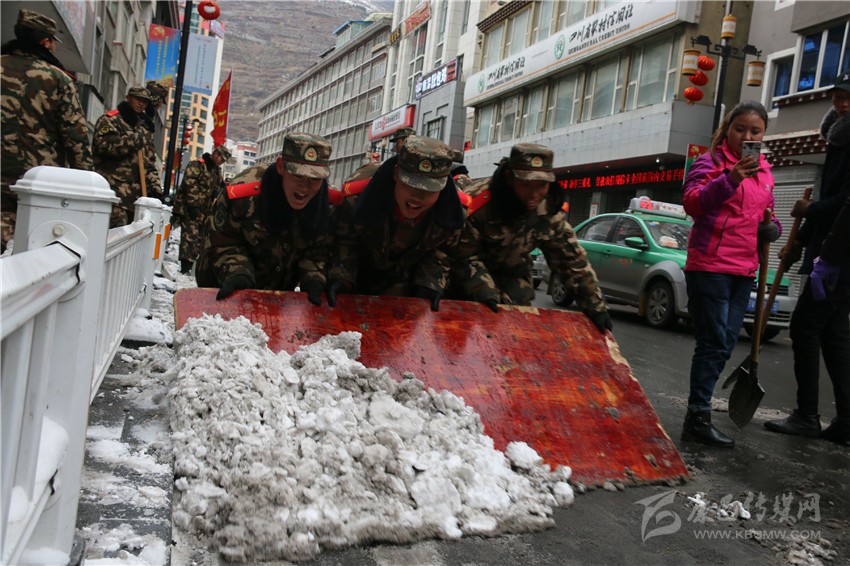 經(jīng)過(guò)奮戰(zhàn),僅半天時(shí)間,康定市城區(qū)主要路段大面積積雪被清除一空,全體官兵又一次用實(shí)際行動(dòng)踐行了“把駐地當(dāng)故鄉(xiāng)、視人民為父母”的光榮傳統(tǒng)。圖為官兵正在清理路面積雪。