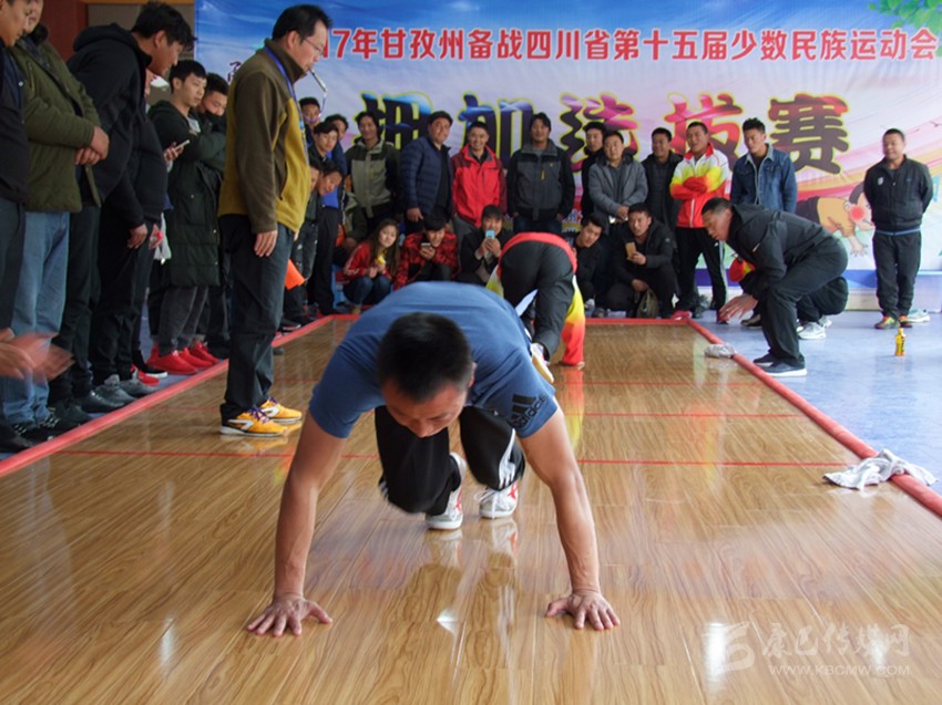 “在地上劃兩條平行線作為河界,中間劃一條中界,準(zhǔn)備一條長(zhǎng)約4米的繩子式布帶并兩端打結(jié)。比賽進(jìn)行時(shí),雙方各自把繩子套在脖子上,兩人相背,將賽繩經(jīng)過腹胸部從襠下穿過,然后趴下,雙手著地,賽繩拉直,聽到比賽開始的口令后,兩人用腿腰肩頸的力量拖動(dòng)布帶奮力向前爬,以將紅布標(biāo)志拉過河界者為勝。押加是在藏區(qū)特殊的自然環(huán)境和獨(dú)特的民族生活習(xí)俗基礎(chǔ)上產(chǎn)生的,在第一屆至第五屆全國(guó)民族運(yùn)動(dòng)會(huì)中押加為表演項(xiàng)目,1999年第六屆全國(guó)民族運(yùn)動(dòng)會(huì)上押加被正式定為競(jìng)賽項(xiàng)目?!笨吹接^眾們對(duì)押加比賽充滿了好奇,教練員呂長(zhǎng)林主動(dòng)介紹說。
