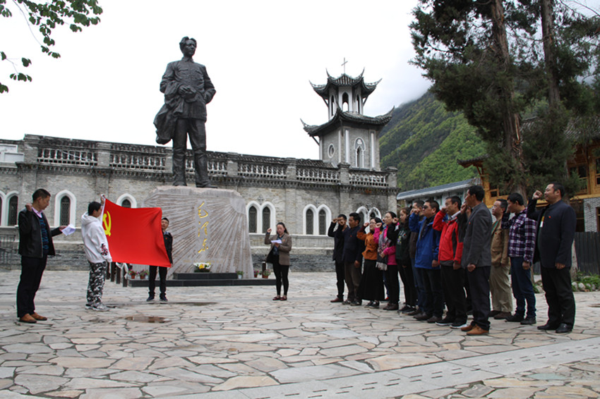 本網(wǎng)訊 (本網(wǎng)記者 秦松 攝影報(bào)道)日前,甘孜日?qǐng)?bào)社全體黨員與群眾工作全覆蓋結(jié)對(duì)共建共創(chuàng)的海螺溝燕子溝鎮(zhèn)的躍進(jìn)坪村支部、南門關(guān)村支部、麻柳林村支部、喇嘛溝村支部的黨員,懷著崇敬的心情來到磨西長(zhǎng)征紀(jì)念館毛主席塑像前,舉行緬懷革命先烈、重溫入黨誓詞活動(dòng)?;顒?dòng)中,黨員們還與共建共創(chuàng)支部黨員進(jìn)行了座談。圖為宣誓活動(dòng)現(xiàn)場(chǎng)。