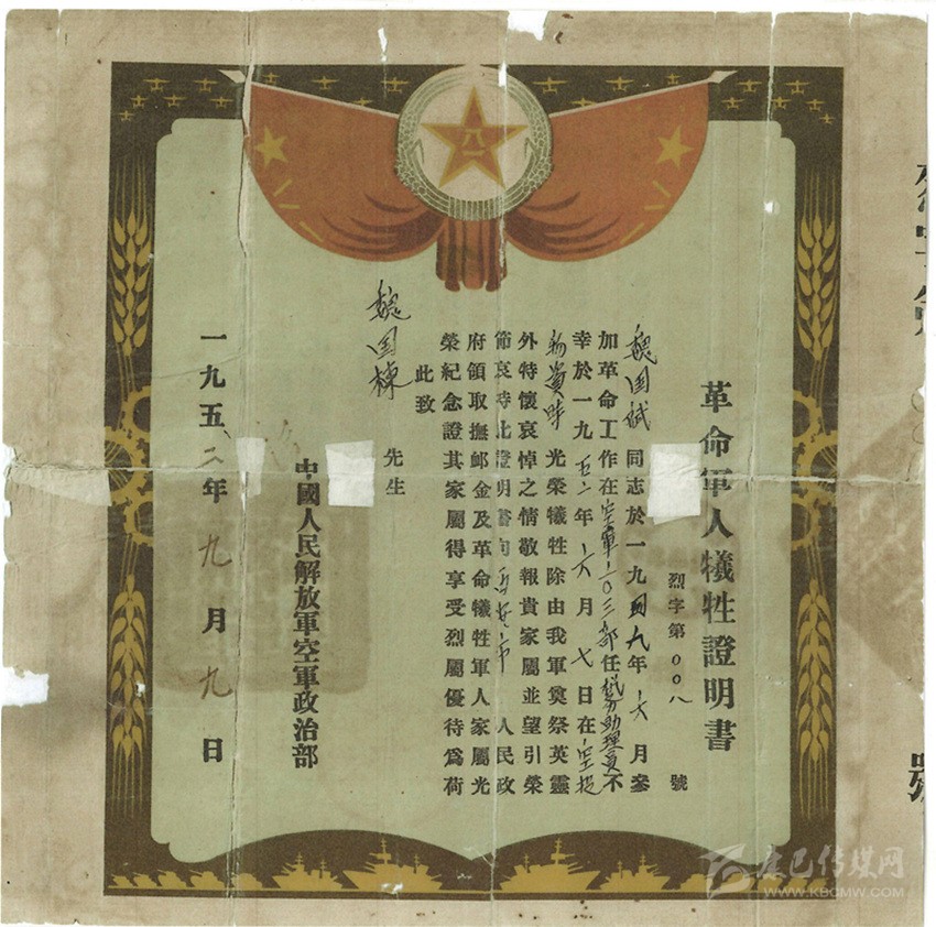 但《革命軍人犧牲證明書》上卻是字字泣血的消息:魏國斌(魏國賓)同志不幸于1952年6月7日執(zhí)行西線任務(wù)空投物資時光榮犧牲。