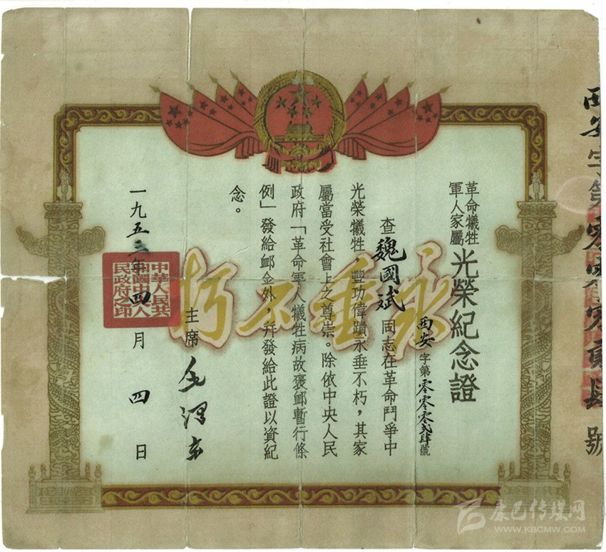 魏國賓革命犧牲軍人家屬光榮紀念證。