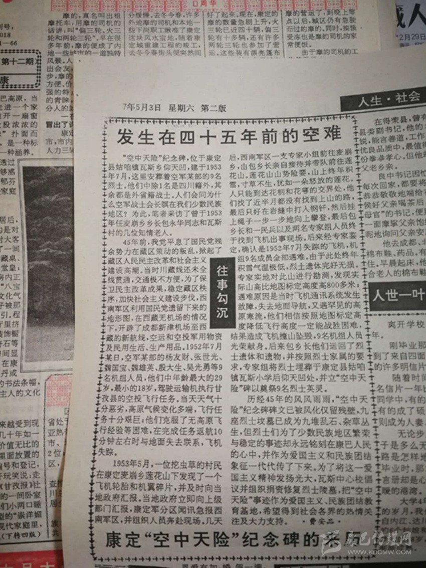 《甘孜日報》1997年5月3日第二版刊登了《發(fā)生在四十五年前的空難——康定“空中天險”紀念碑的來歷》一文,詳細記錄了1952年空軍某部9名人員駕駛運輸機執(zhí)行空投飛行任務(wù),不幸在康定地區(qū)撞山墜毀,英勇犧牲的故事。這9名烈士后被當(dāng)?shù)厝罕姲苍?,建立“空軍墓”和“空中天險”紀念碑。 作為烈士犧牲地的甘孜多年來一直在尋找這9名烈士家屬,以圖告慰英靈。但由于線索有限,一直未有結(jié)果。
