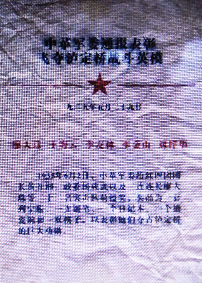 劉東升談起父親當(dāng)年作為飛奪瀘定橋22勇士之一,心情無比激動?!案赣H當(dāng)年如果不是努力爭取,就沒有后來的勇士稱號,更沒有中革軍委的嘉獎。”1935年5月,北上抗日的紅軍向天險大渡河挺進(jìn)。大渡河水流湍急,兩岸都是高山峻嶺,只有一座鐵索橋可以通過。這座鐵索橋,就是紅軍北上必須奪取的瀘定橋。