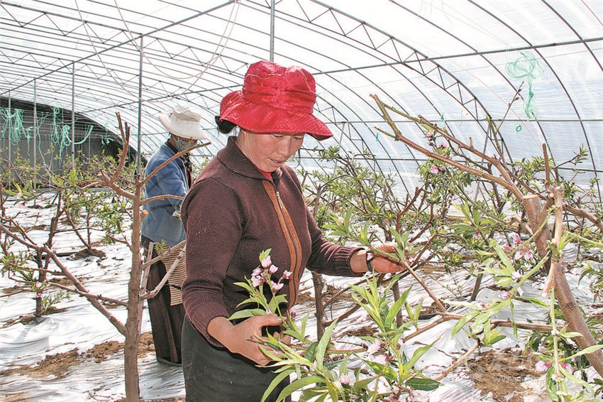 圖為當(dāng)?shù)貏?wù)工農(nóng)牧民正在給高原大棚桃樹(shù)疏枝。