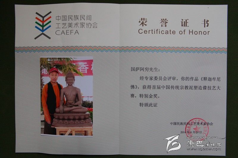 由中國民族民間工藝美術家協會主辦的“首屆中國宗教泥塑技藝大賽”,旨在傳承宗教泥塑造像技藝,搭建宗教造像藝術家展示平臺。本次大賽共有來自臺灣、香港、天津、河北、四川、西藏、云南、浙江、江蘇、貴州、江西、寧夏、江西等地的39名泥塑高手現場制作,角逐獎項。我州的國薩阿窮等三名藝人現場制作的泥塑作品《釋迦牟尼》榮獲特別金獎,同時,國薩阿窮還榮獲了“中國傳統(tǒng)工藝美術大師(宗教雕塑)”榮譽證書。