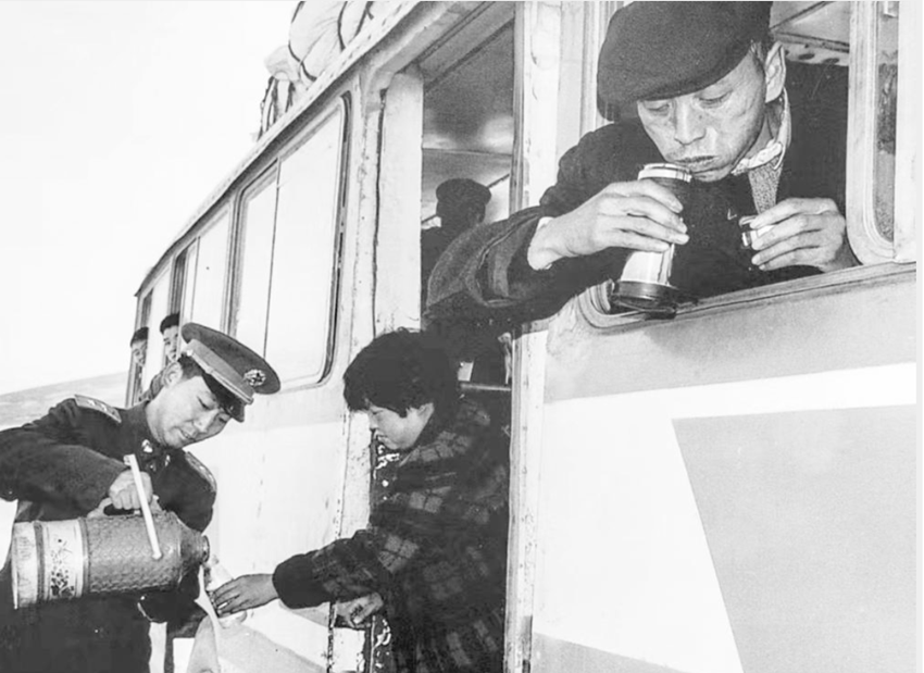 90年代,官兵為過往車輛提供開水。