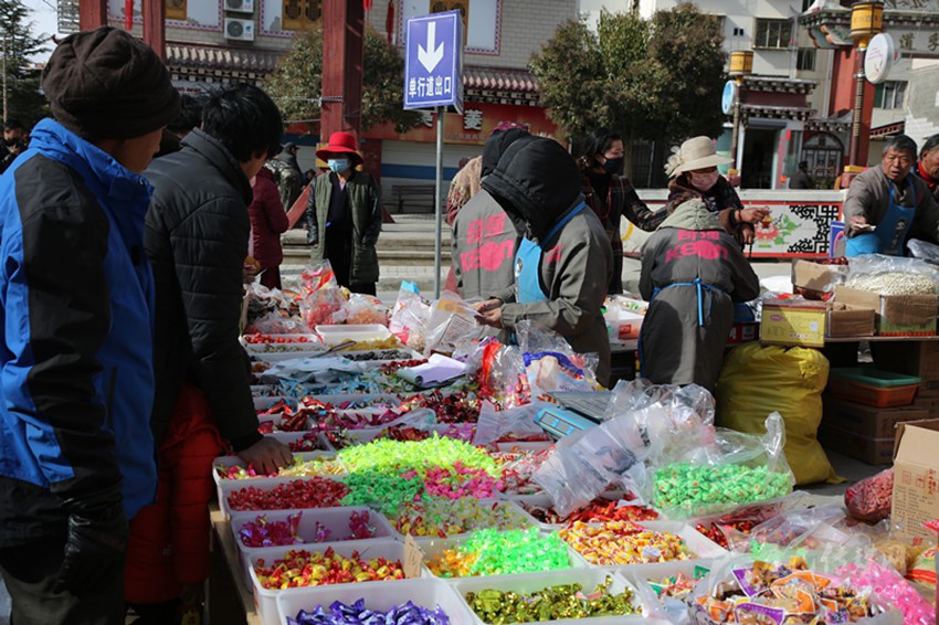 來自格西鄉(xiāng)的青志巴姆買了一大堆糖果,又到塑料制品攤點與攤主討價還價,用30元買了一個糖果盒?!耙酝枪S便放在桌上,既不好看又不衛(wèi)生;現(xiàn)在條件好了,也該講究講究?!彼嬖V記者,農(nóng)村集市貿(mào)易活動辦得好,商品集中,家里的年貨在集市里就辦齊了。