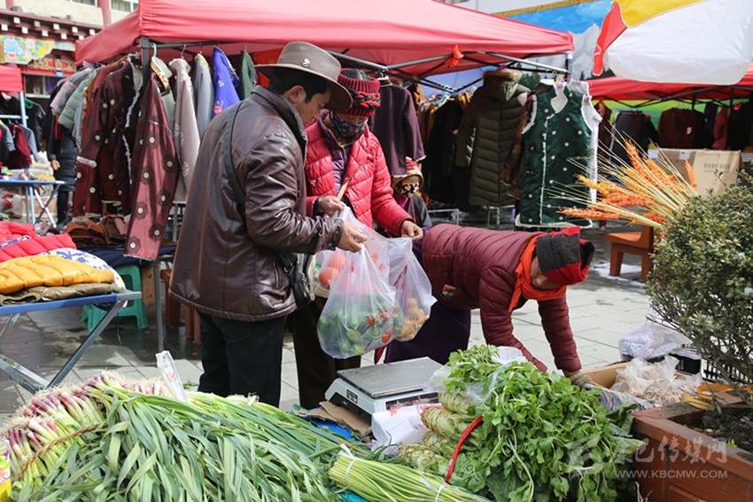 記者看到,集市上圍滿了背著背簍采購年貨的群眾,他們有的拿著新款式的藏裝比來比去,有的對著圖案豐富的藏毯左挑右選,有的在購買商品“犒勞自己”,有的在為后輩“獻著愛心”,大家都在選購著心儀的年貨。