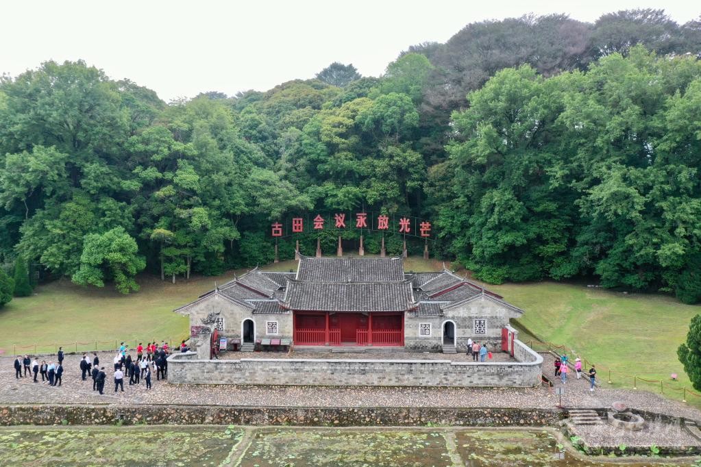 游客在福建省龍巖市上杭縣古田鎮(zhèn)古田會(huì)議會(huì)址參觀(2021年5月9日攝,無(wú)人機(jī)照片)。新華社記者姜克紅攝