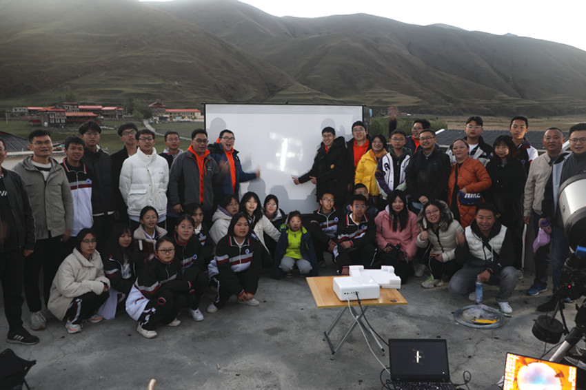 “向天空出發(fā)”公益幸福團成員和瀘定中學師生們展示捕捉到的“天宮”空間站影像。