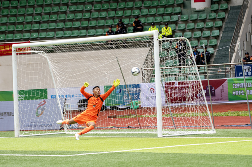 隨著主裁判吹哨發(fā)令,身穿白色球衣的甘南隊(duì)及藍(lán)色球衣的昌都隊(duì)球員各赴站位,迅速進(jìn)入狀態(tài)。上半場,甘南隊(duì)積極拼搶、快速進(jìn)攻、精準(zhǔn)傳球,很快主導(dǎo)場上局勢(shì)。而昌都隊(duì)雖后防穩(wěn)健,進(jìn)攻則顯得略為保守。第9分鐘,甘南隊(duì)員在大禁區(qū)前沿帶球晃過昌都隊(duì)員后,雙方爭奪激烈,甘南隊(duì)員倒地,裁判鳴哨,甘南隊(duì)獲得前場任意球機(jī)會(huì)。在此前比賽中已打入2球的33號(hào)球員索南道吉站上罰球點(diǎn),短暫調(diào)整后打出一記弧線球,昌都隊(duì)門將撲救不及,足球應(yīng)聲入網(wǎng),甘南隊(duì)取得1:0領(lǐng)先。