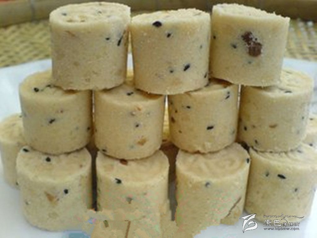 炸白年糕 原料 糯米1000克,茶油100克。 做法 將糯米洗凈浸透后瀝去水上蒸籠蒸至熟爛,取出用木棒搗爛,壓展成塊,用刀切成約50克的小塊,然后將年糕放入燒沸的油鍋中,待炸成年糕翻白浮起時(shí),即可撈出。