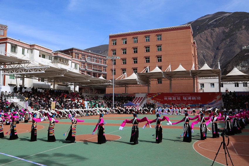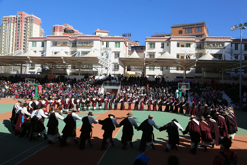 弦音聲動(dòng)鬧新年,紅綾長袖舞春風(fēng),千人弦子鍋莊,唱出龍年大團(tuán)圓,踏出幸福新舞步……2月13日,在巴塘縣全民健身活動(dòng)中心舉行的春節(jié)暨藏歷新年系列活動(dòng)“文化·點(diǎn)靚生活”——巴塘縣五彩藏鄉(xiāng)藝術(shù)周弦子鍋莊展演活動(dòng)現(xiàn)場喜氣洋洋、人頭攢動(dòng),上千名群眾身穿節(jié)日盛裝,拉起弦胡,載歌載舞,共同慶祝新春佳節(jié),祈盼龍年國泰民安、風(fēng)調(diào)雨順。圖為活動(dòng)現(xiàn)場。 敖梅 李穎/文 格桑澤仁/圖