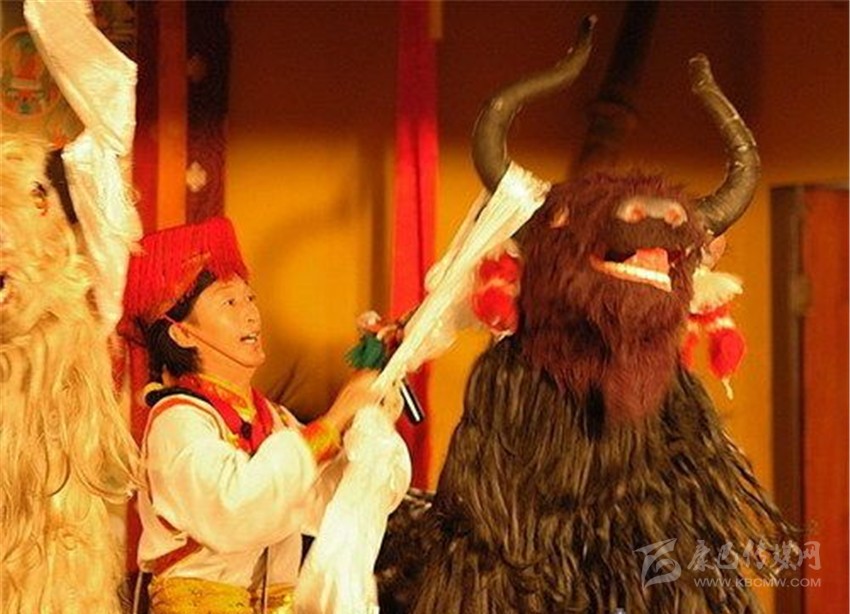 之后,由演員扮演的牦牛會(huì)上場(chǎng),牦牛由兩個(gè)演員扮演。一黑一白兩頭牦牛。關(guān)于白牦牛和黑牦牛的象征意義,說(shuō)法不一,有的說(shuō)白牦牛象征前藏地區(qū),黑牦牛象征后藏地區(qū);有的說(shuō)白牦牛象征溫順和善良,黑牦牛象征勇猛和彪捍。